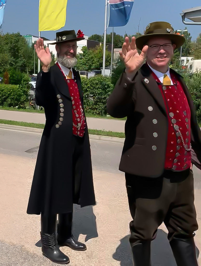 Die Buam tragen zum Schuhplatteln die kurze schwarze Lederhose, graue Joppe, grüne Weste, grüner Hut mit Adler-Flaum, wollweiße Strümpfe und schwarze Halbschuhe.